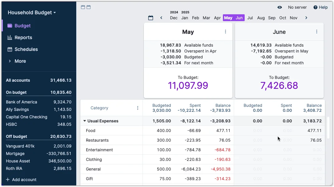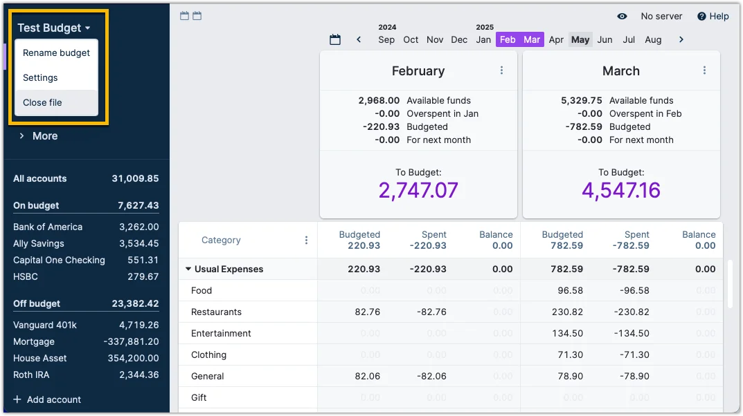 That is it. The backup is now restored. If the imported budget is a copy of your current budget, you may want to rename the import by clicking on its name and rename it. Once you verify the new imported budget is correct, you can navigate back to the budget selection screen by closing the current budget and deleting the old copy.